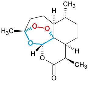 아르테미시닌 (파란색으로 표시된 부분은 트리옥세인 구조이고 빨간색으로 표시된 부분이 엔도페록시드 부분이다.) 작가 스롱333. 출처: 위키미디어 커먼즈. ( https://commons.wikimedia.org/wiki/File:Artemisinin.jpg ) 라이선스: CC BY 4. 0.